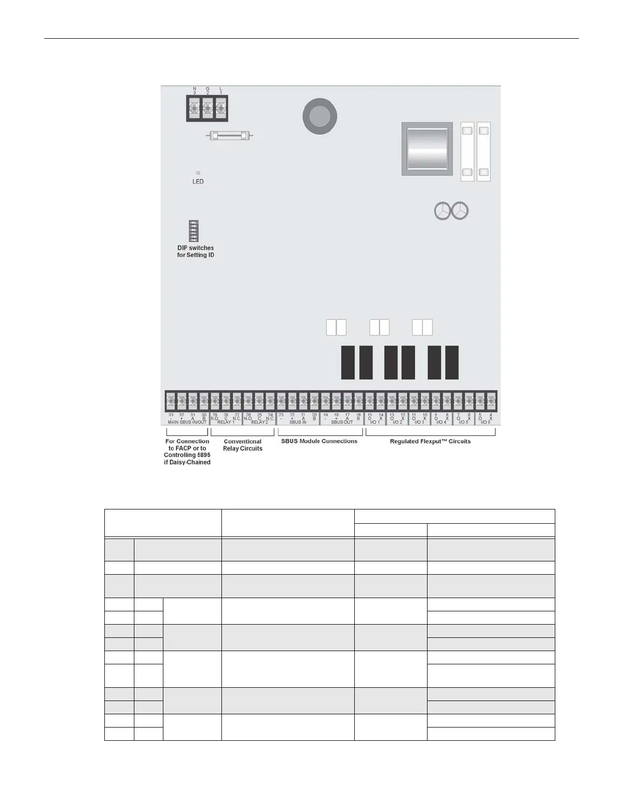 Figure 2.3 shows the 5895XL circuit board including location of terminals, the DIP switch for setting module ID, and the LED.