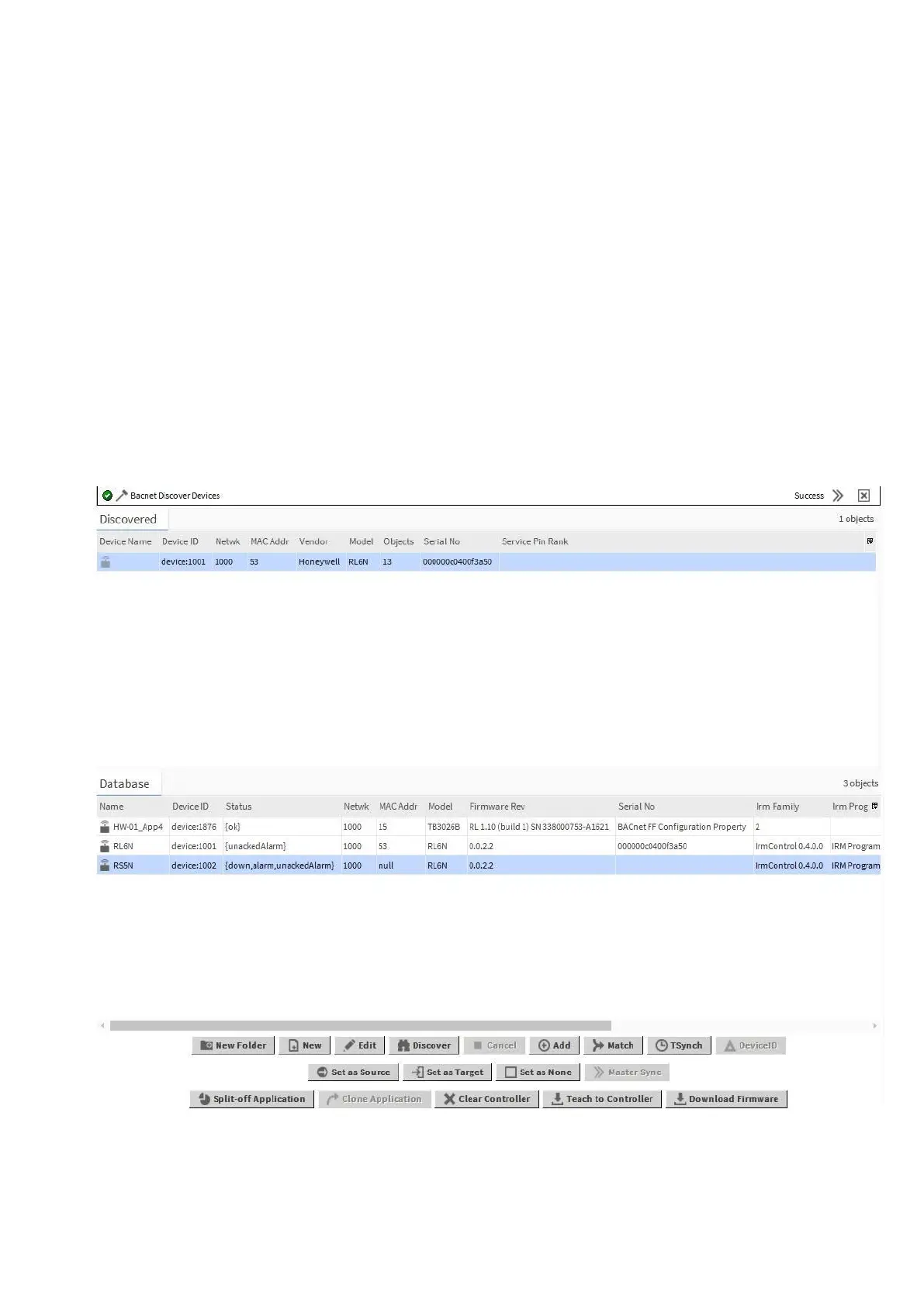 3. On the Discovered pane, select the online device and in the Database pane, select the offline created IRM BACnet
