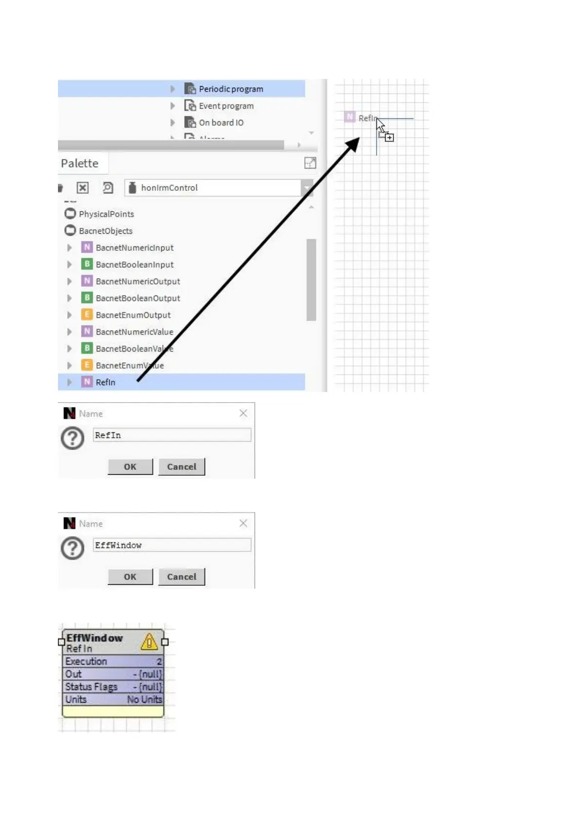 10. In the honIrmControl palette, expand BacnetObjects, and then drag & drop the RefIn BACnet object to the wire sheet.
