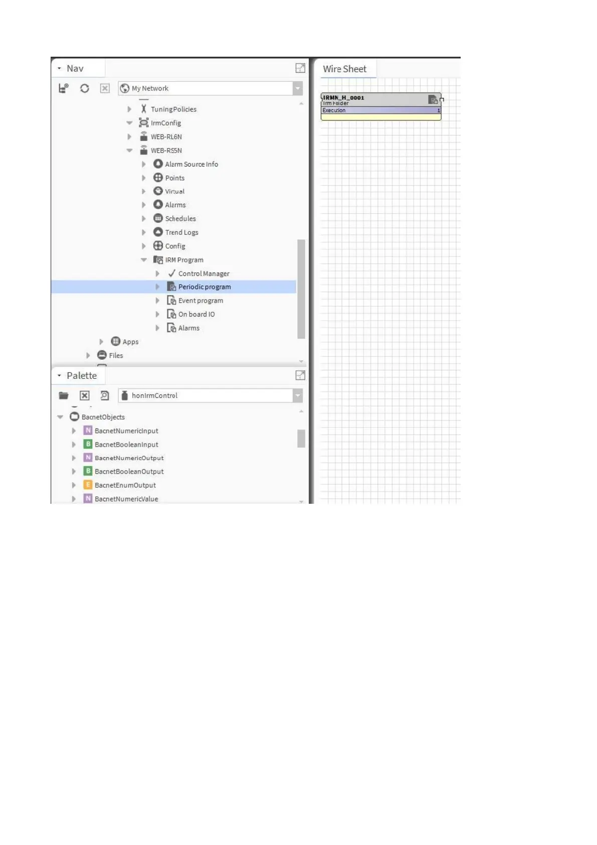 9. In the honIrmControl palette, expand BacnetObjects, and then drag & drop the RefOut BACnet object to the wire