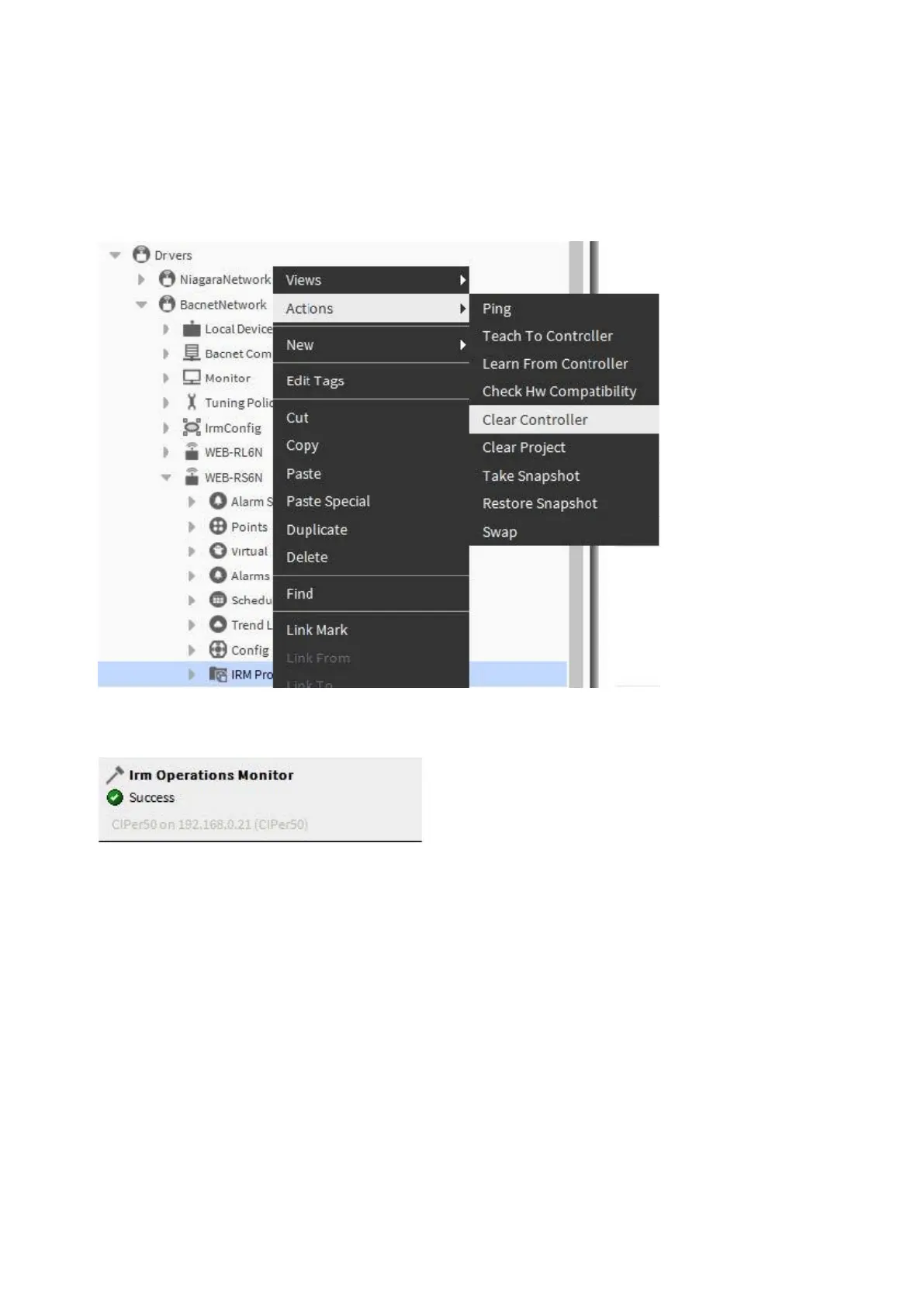 1. Right-click on IRM Program in the tree, then click Actions, and then click Clear Controller in the context menu.