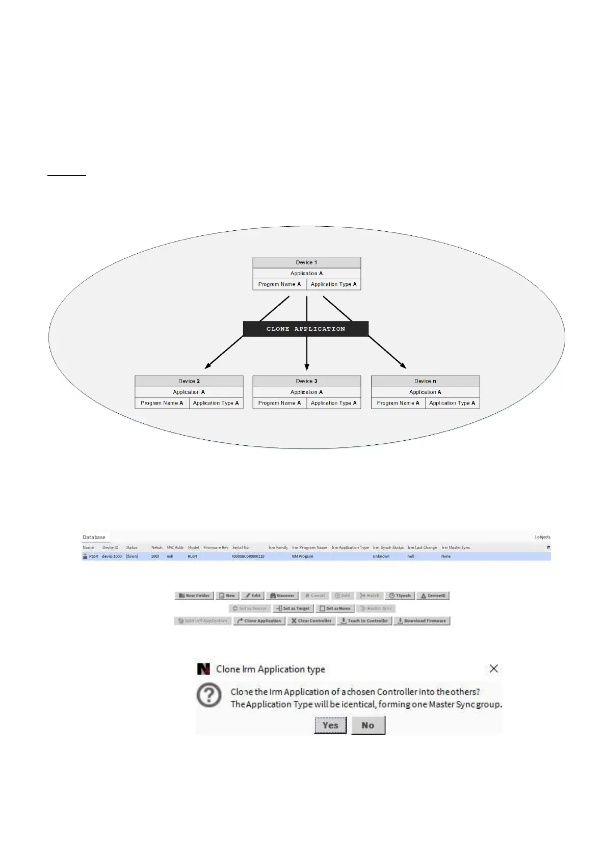 program name A and application type A. The application is cloned using device 1 as template and the devices 2 through