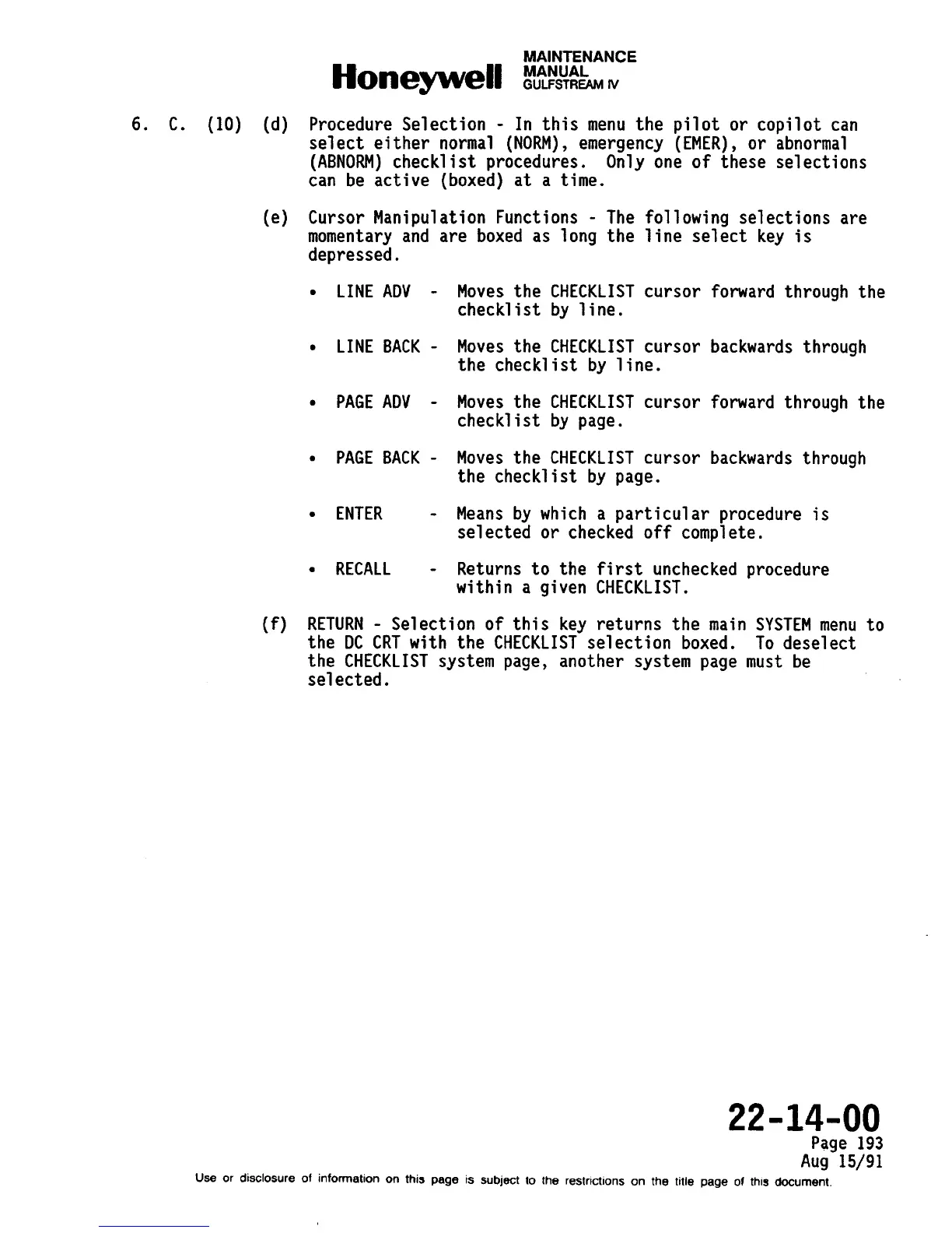 ● PAGE ADV - Moves the CHECKLIST cursor forward through the