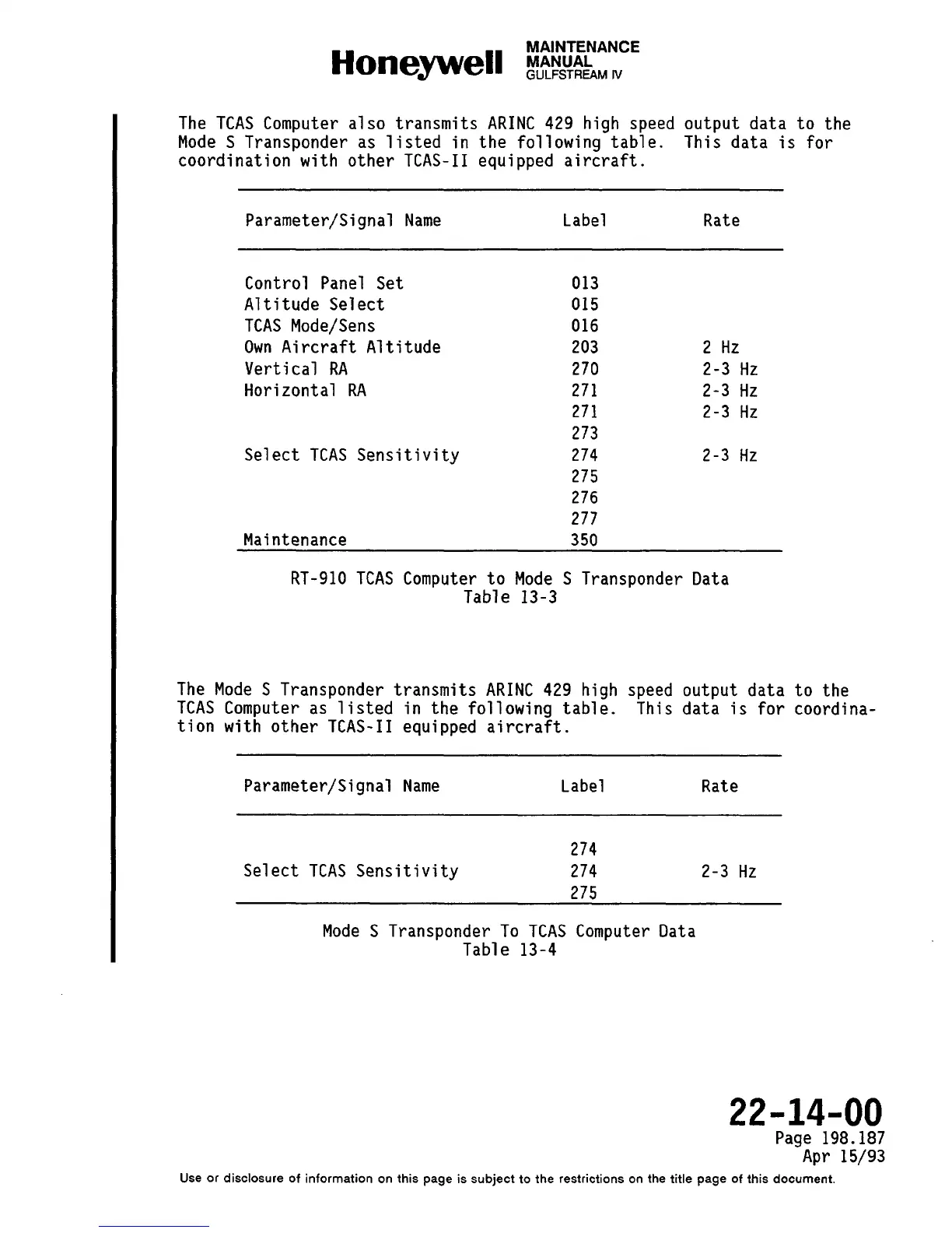 The TCAS Computer also transmits ARINC 429 high speed output data to the