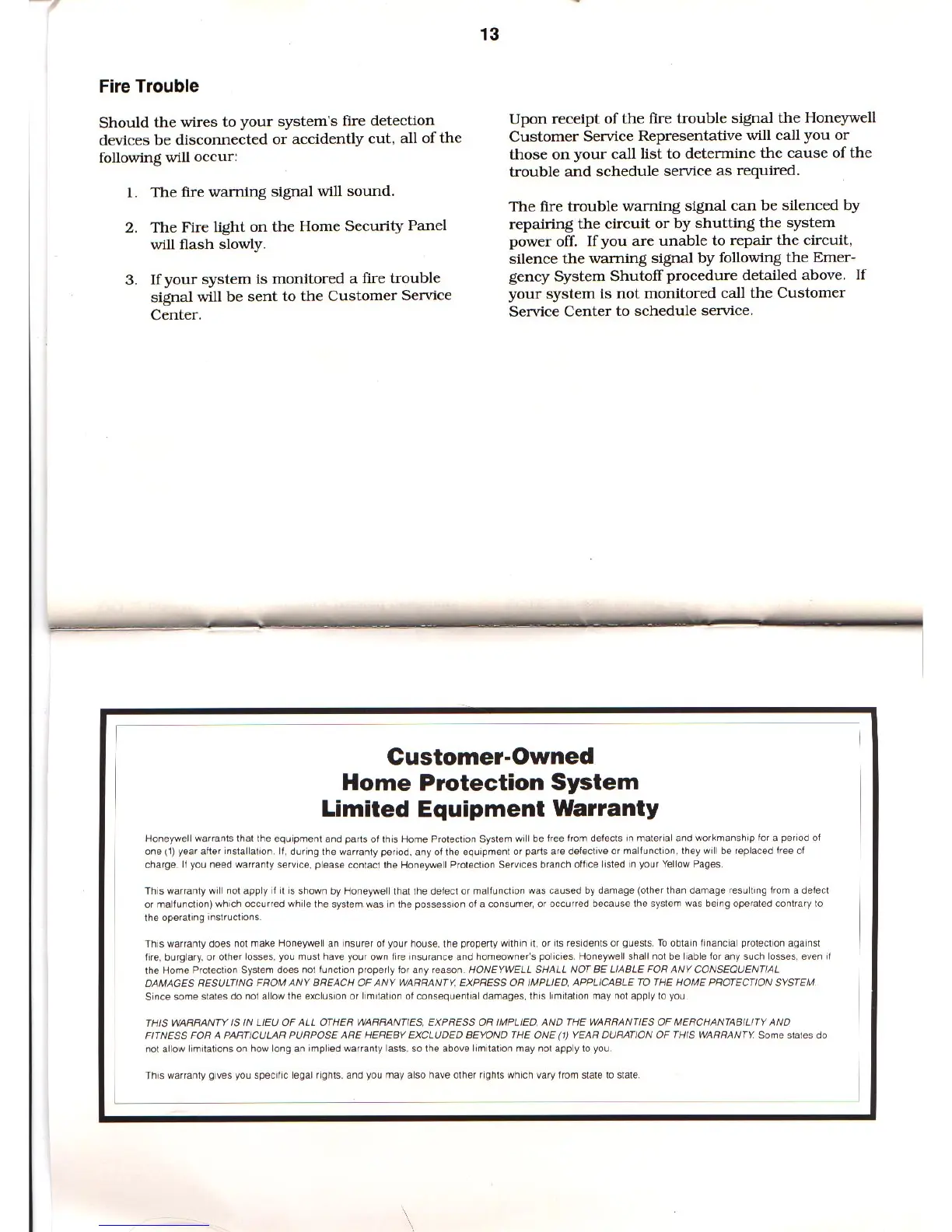 Honeywell System 1500e - Fire Trouble and Warranty; Fire Trouble Signal; Limited Equipment Warranty