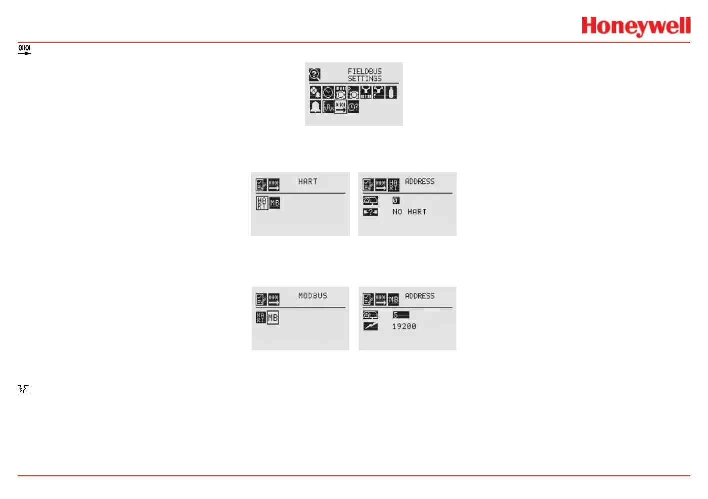 Fieldbus Settings displays the current conguration of both HART and Modbus. To change the settings see Fieldbus Options. HART