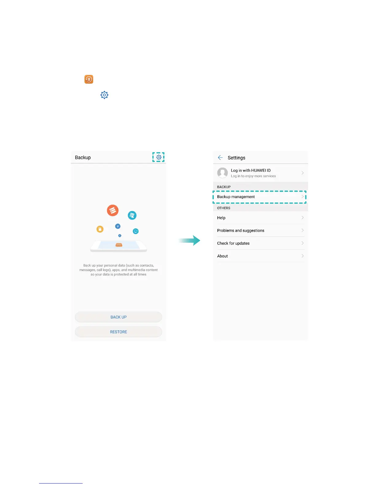 2 Then touch the icon at the top of screen, and then touch Backup management.