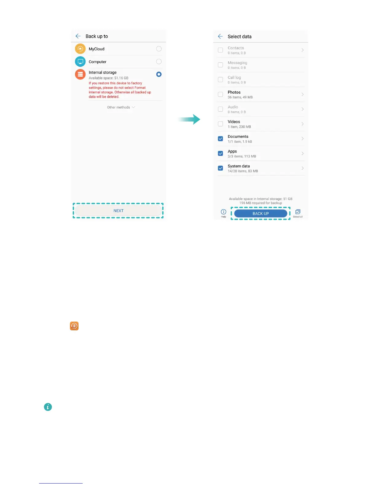 3 Select the data you want to back up and touch Back up. You can then touch Select all in the