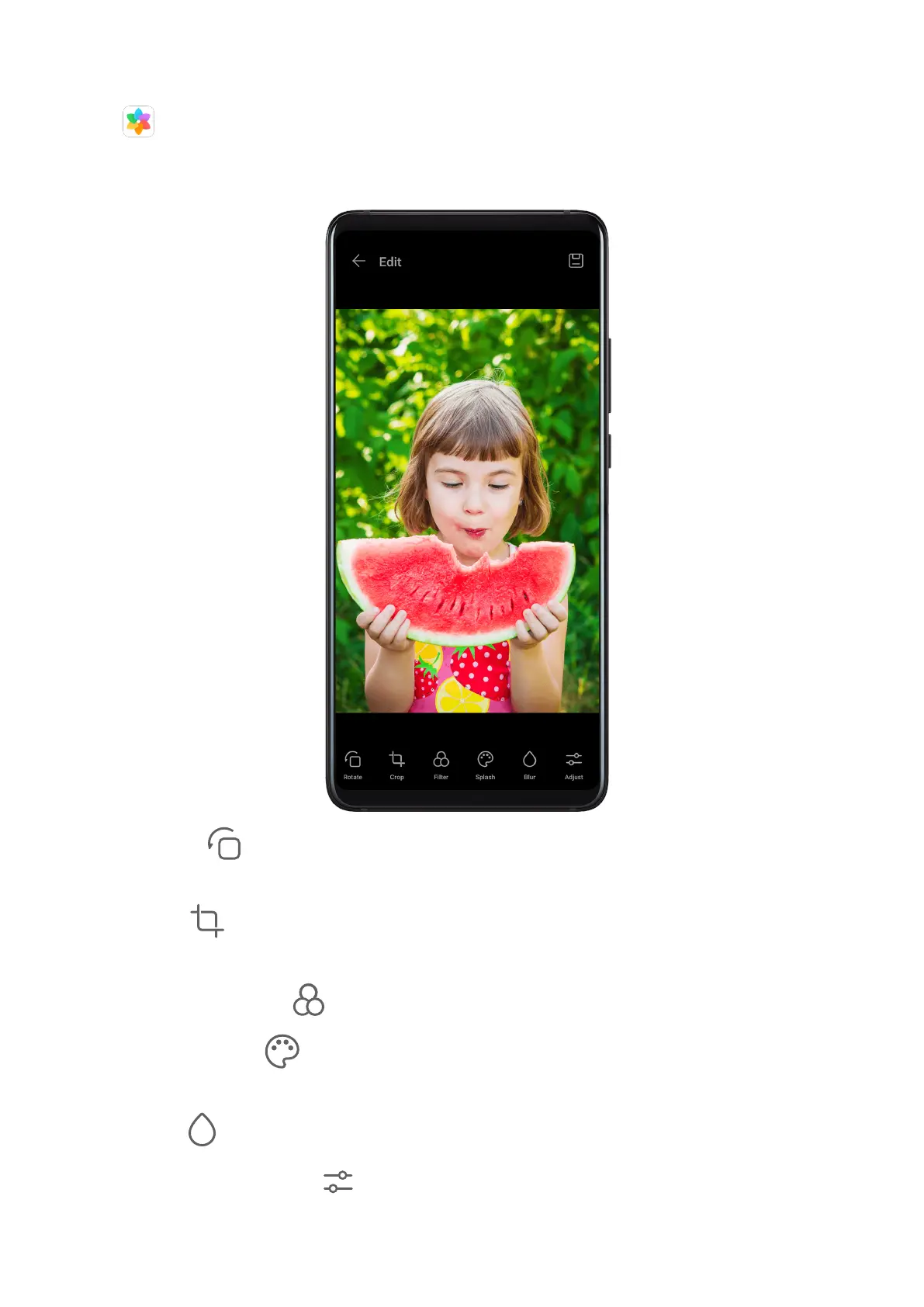 Open Gallery, touch the thumbnail of the photo you want to edit, then touch Edit to