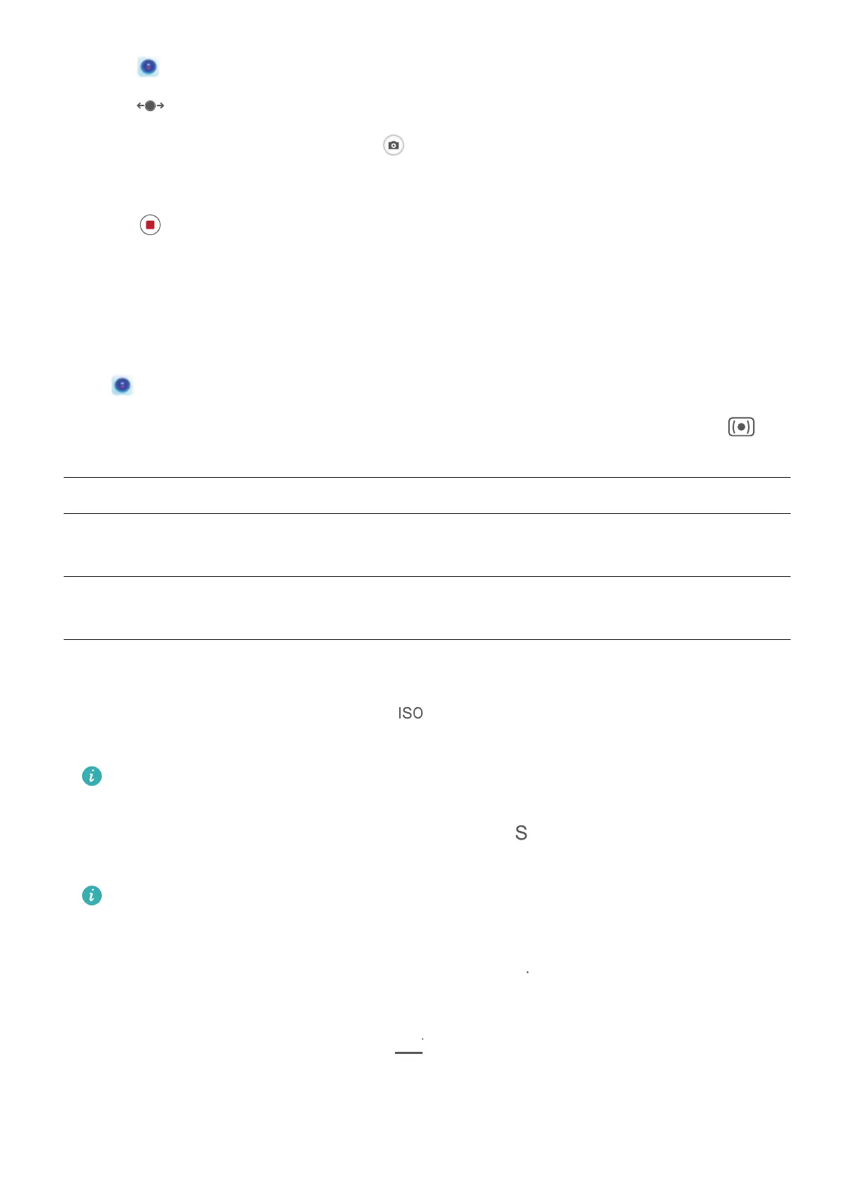 l Adjust ISO: On the Pro mode screen, touch , and swipe left or right on the ISO slider to adjust