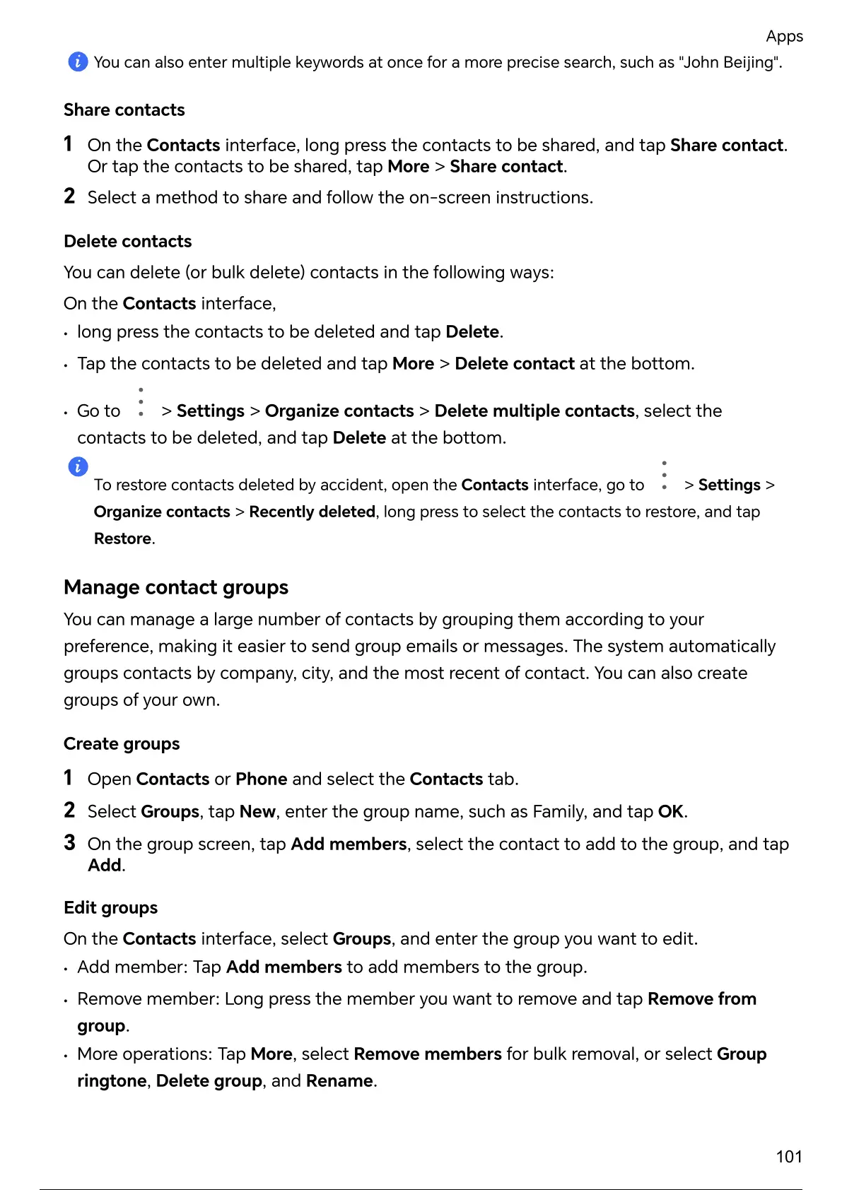 • Tap the contacts to be deleted and tap More > Delete contact at the bottom.