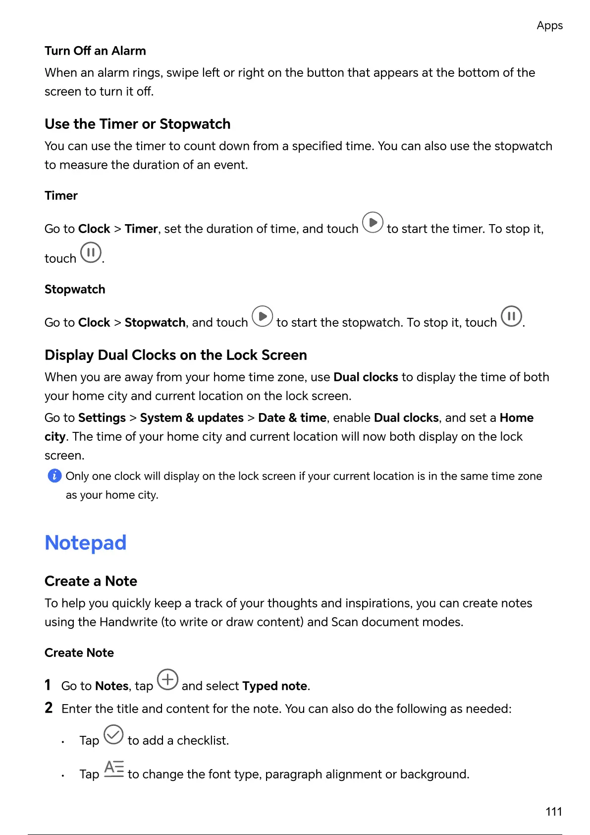 When you are away from your home time zone, use Dual clocks to display the time of both