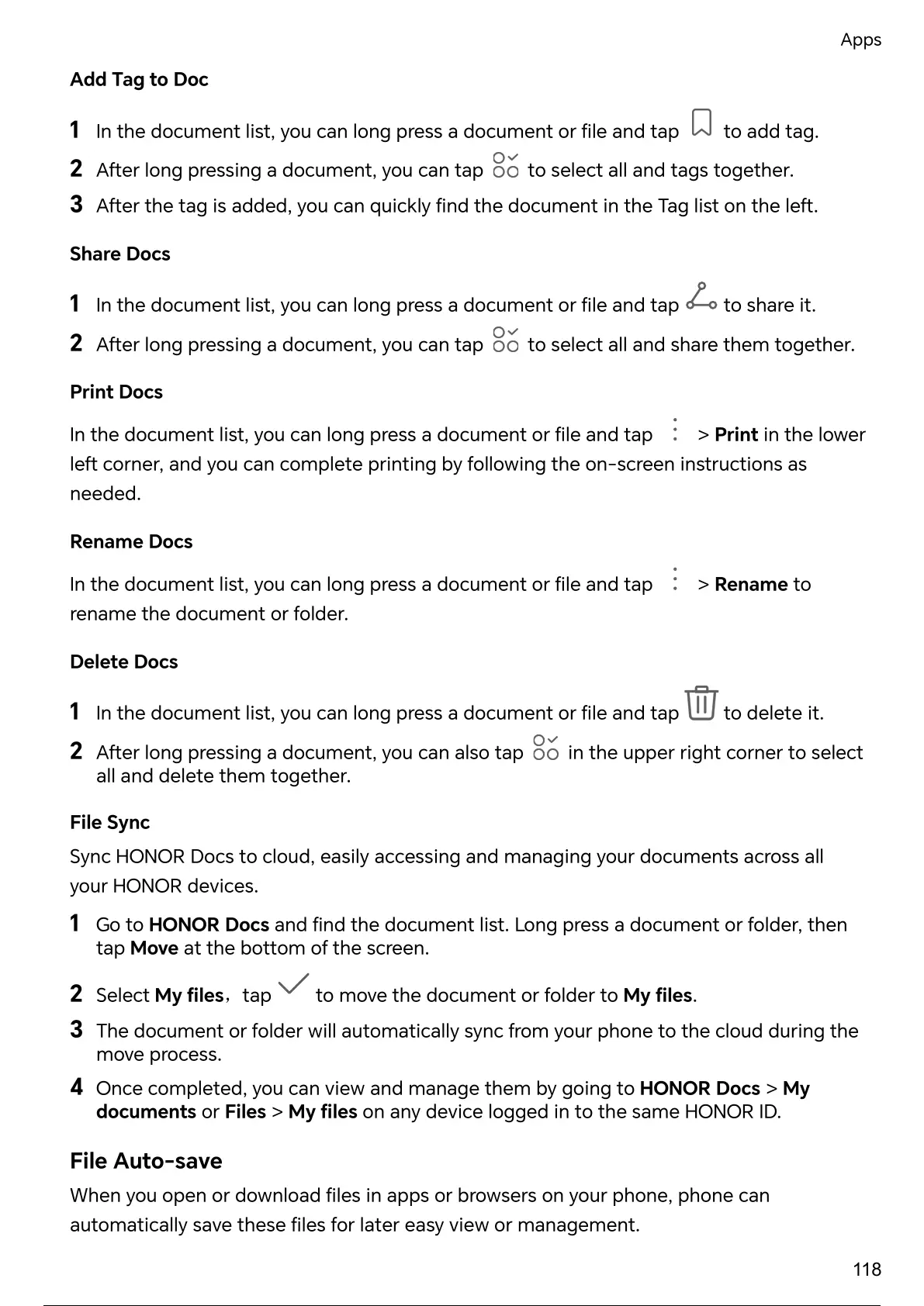1 Go to HONOR Docs and the document list. Long press a document or folder, then