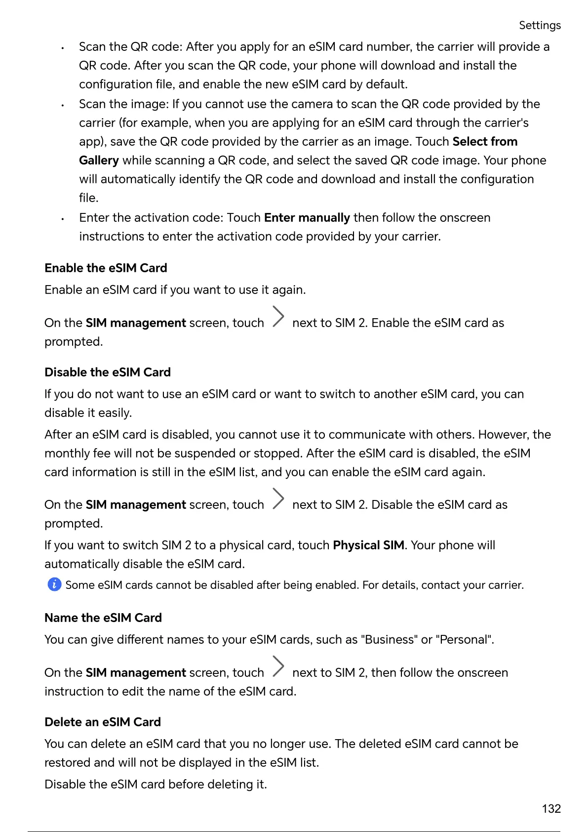 Some eSIM cards cannot be disabled after being enabled. For details, contact your carrier.