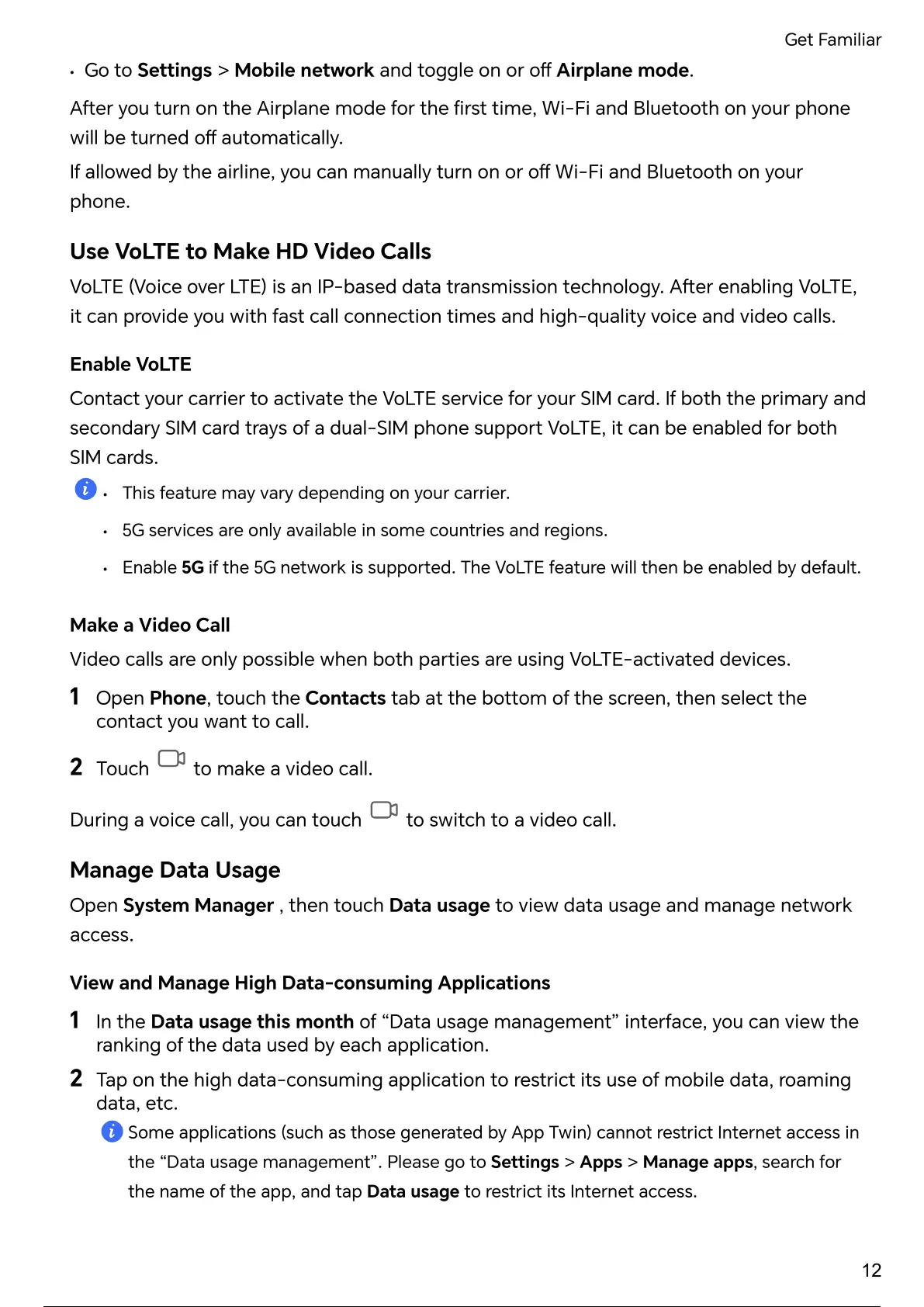 • Go to Settings > Mobile network and toggle on or Airplane mode.