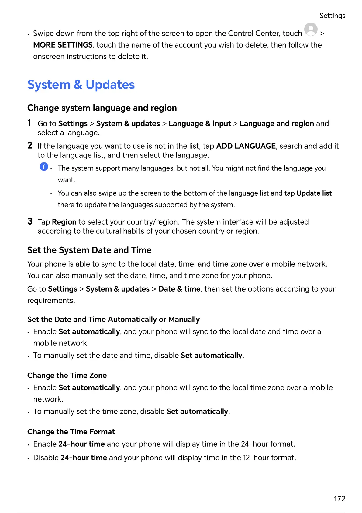 MORE SETTINGS, touch the name of the account you wish to delete, then follow the