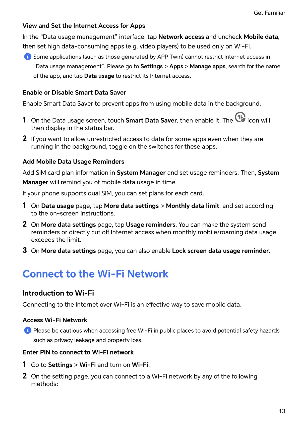 Connecting to the Internet over Wi-Fi is an way to save mobile data.