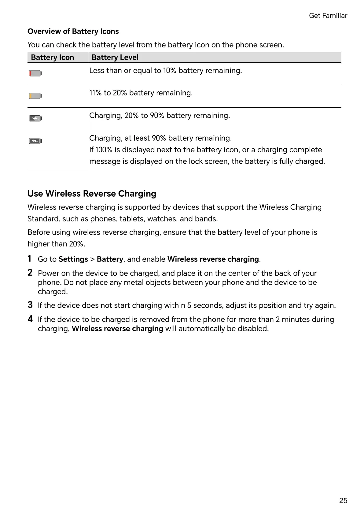 Before using wireless reverse charging, ensure that the level of your phone is