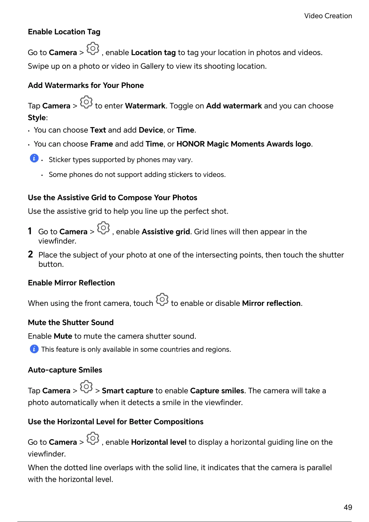 Go to Camera > , enable Location tag to tag your location in photos and videos.