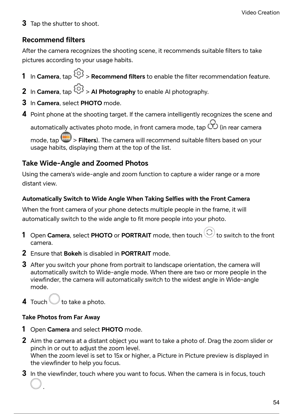 Using the camera's wide-angle and zoom function to capture a wider range or a more