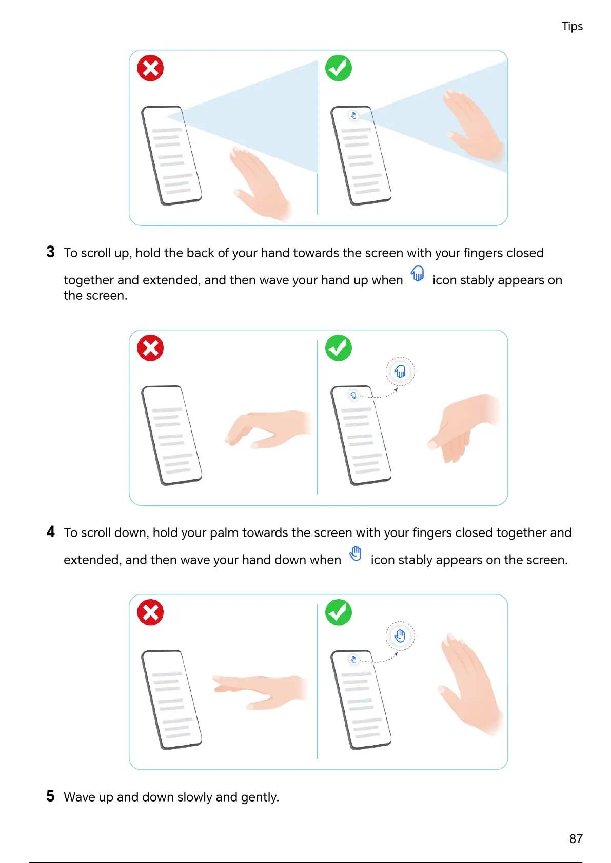 3 To scroll up, hold the back of your hand towards the screen with your closed