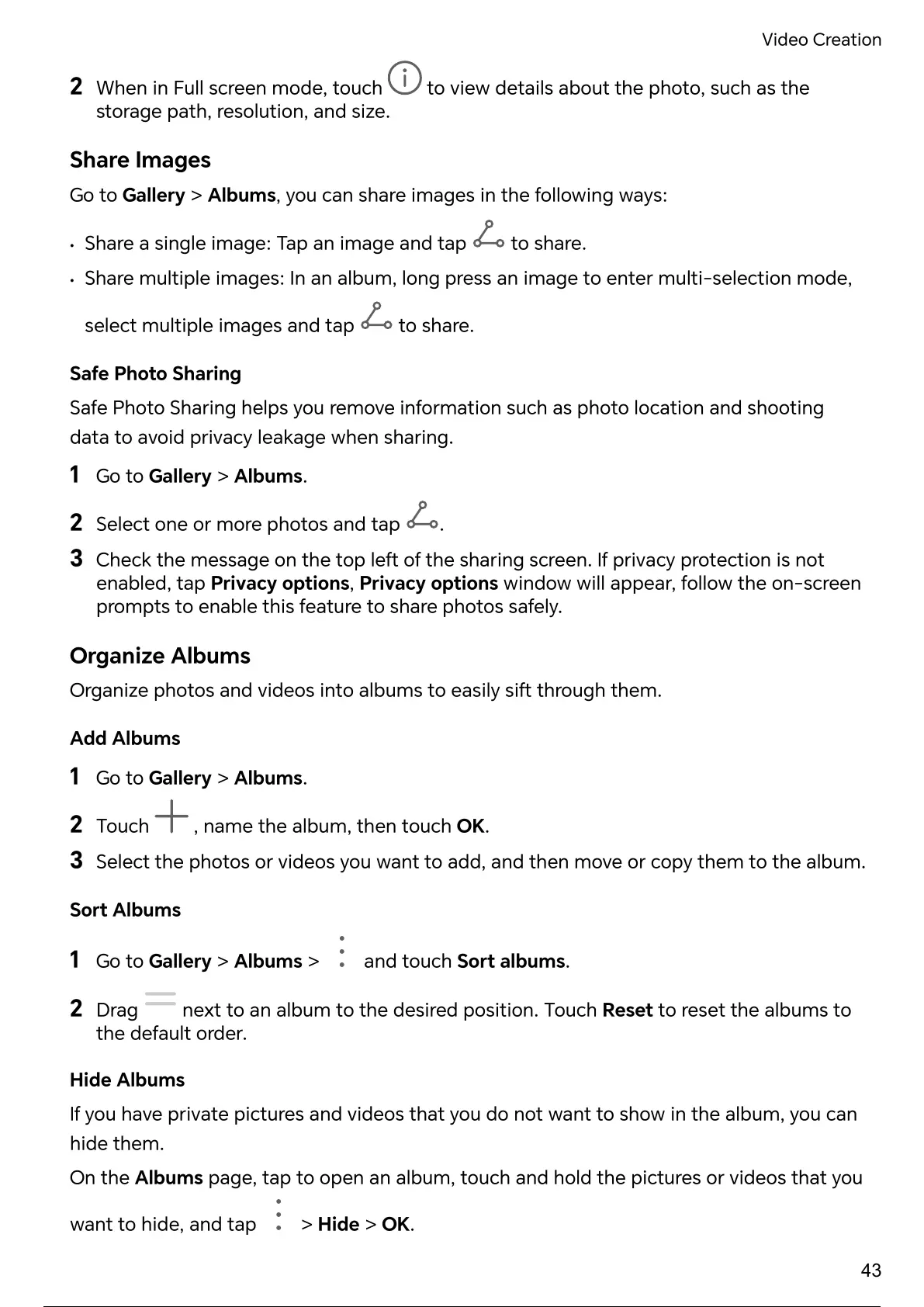 • Share multiple images: In an album, long press an image to enter multi-selection mode,