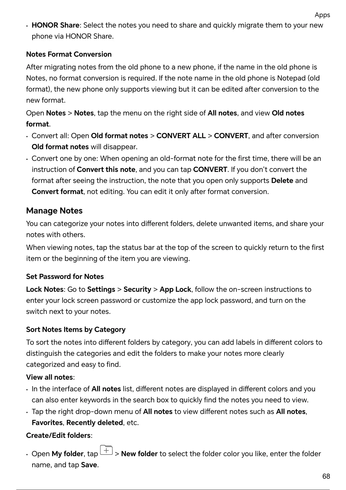 • HONOR Share: Select the notes you need to share and quickly migrate them to your new