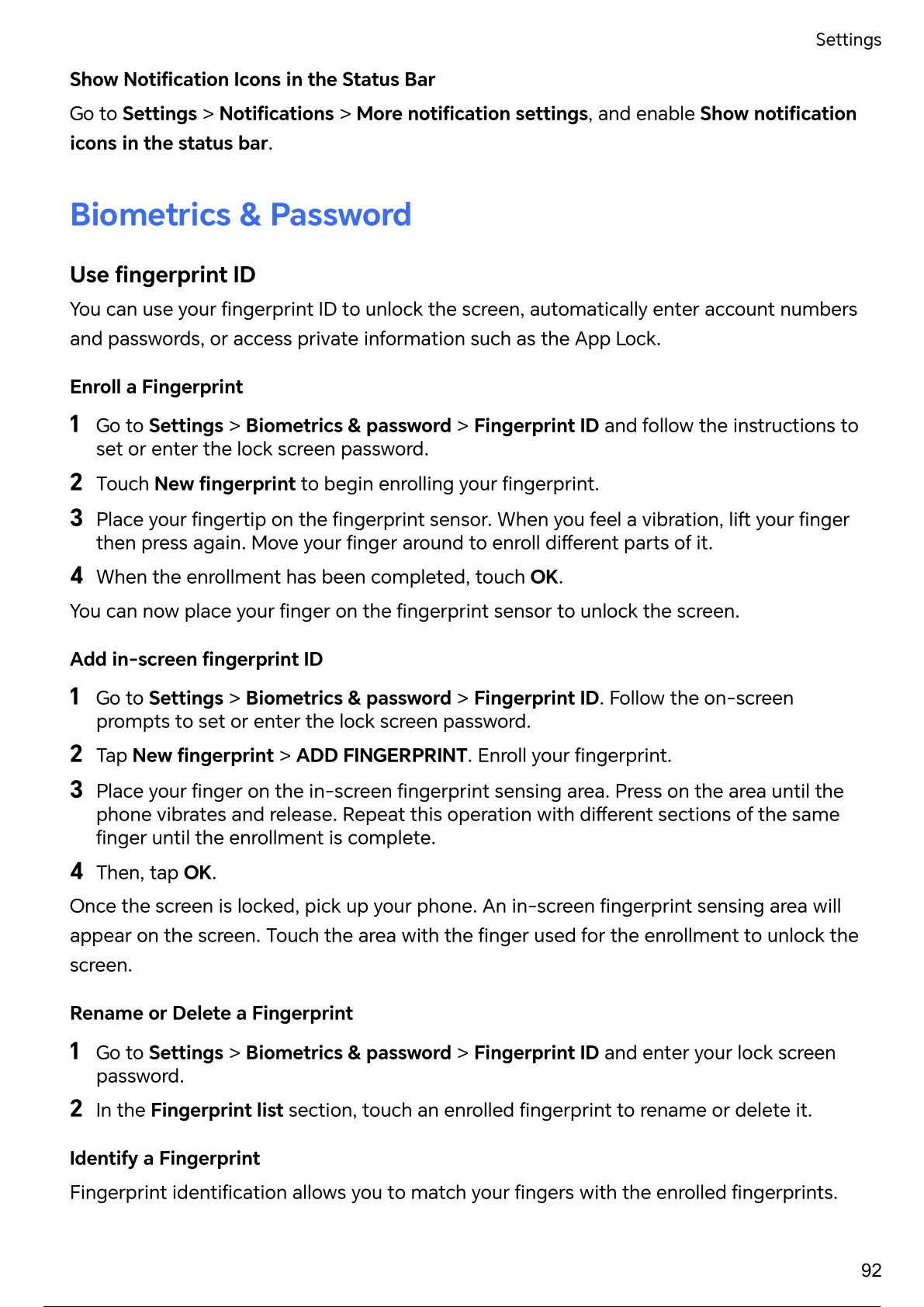 1 Go to Settings > Biometrics & password > Fingerprint ID and follow the instructions to