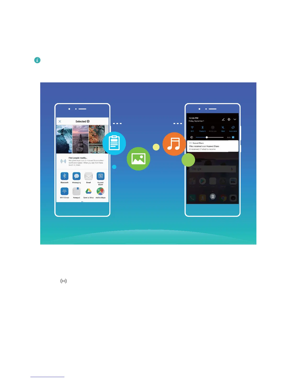 Huawei Share uses Bluetooth to detect nearby Huawei devices and Wi-Fi to quickly transfer les