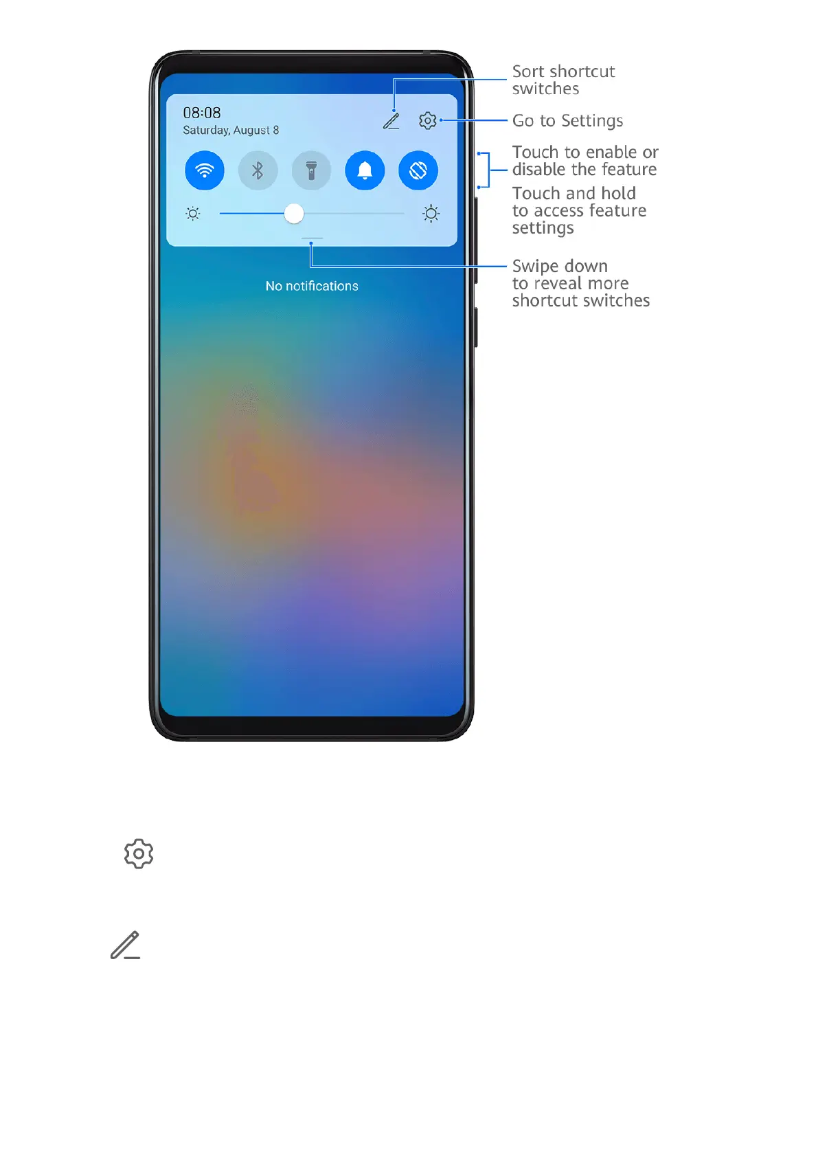 • Touch and hold a shortcut switch to access the settings screen of the corresponding feature.