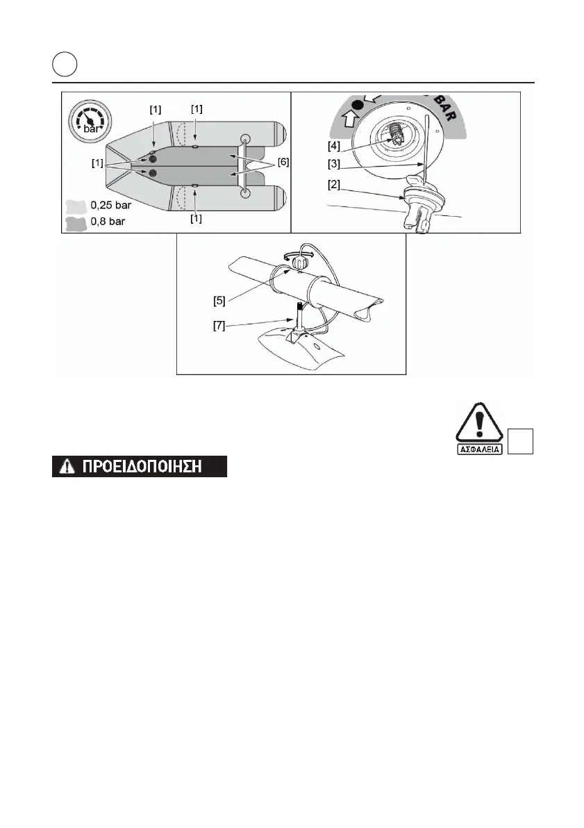 • Πριν από κάθε χρήση, ελέγχετε την πίεση αέρα χρησιμοποιώντας τον μετρητή πίεσης που παρέχεται μαζί με το σκάφος.