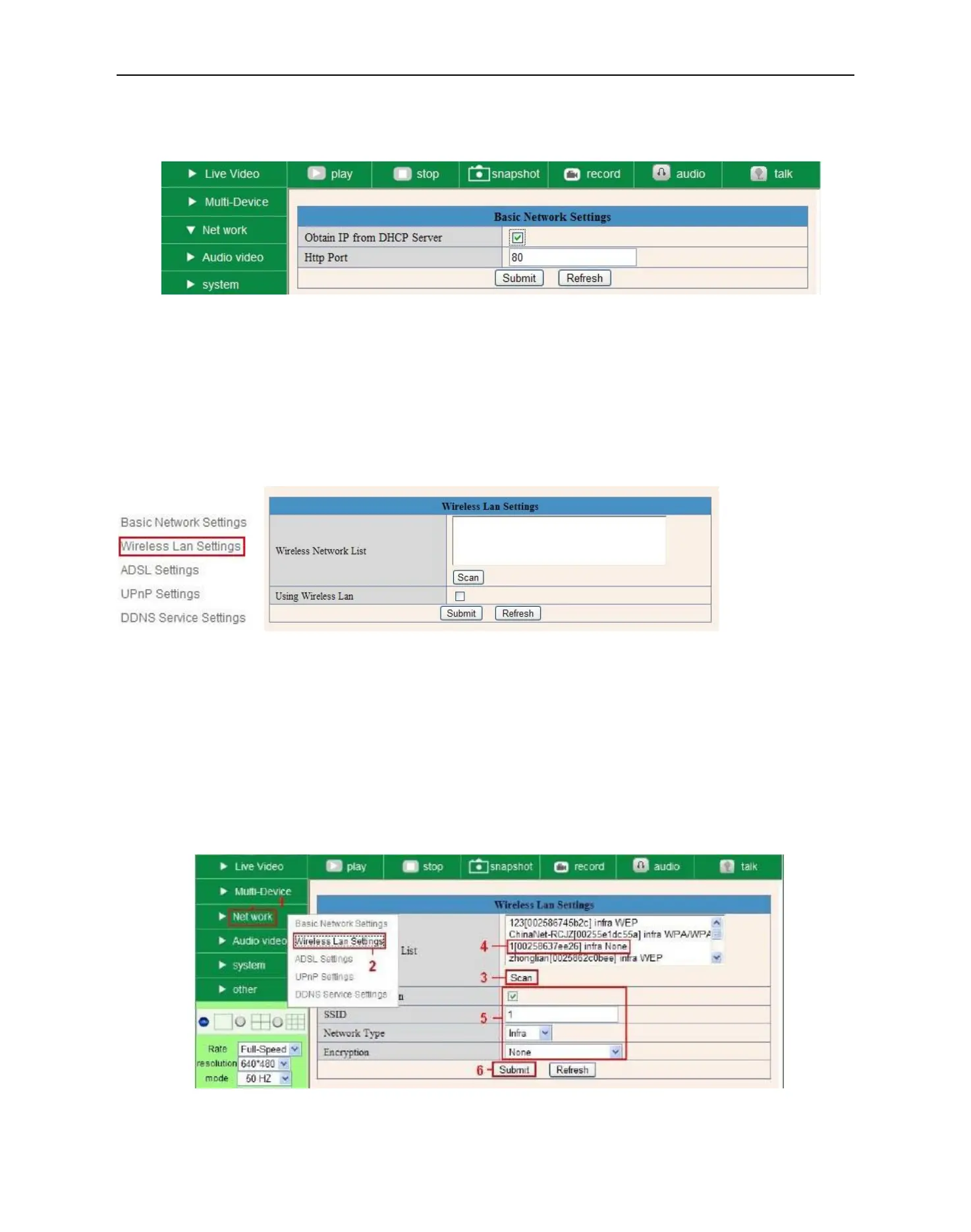4. Login the camera, click “Network”>”Wireless Lan Settings”>”Scan”, please scan 2 times, then you will find