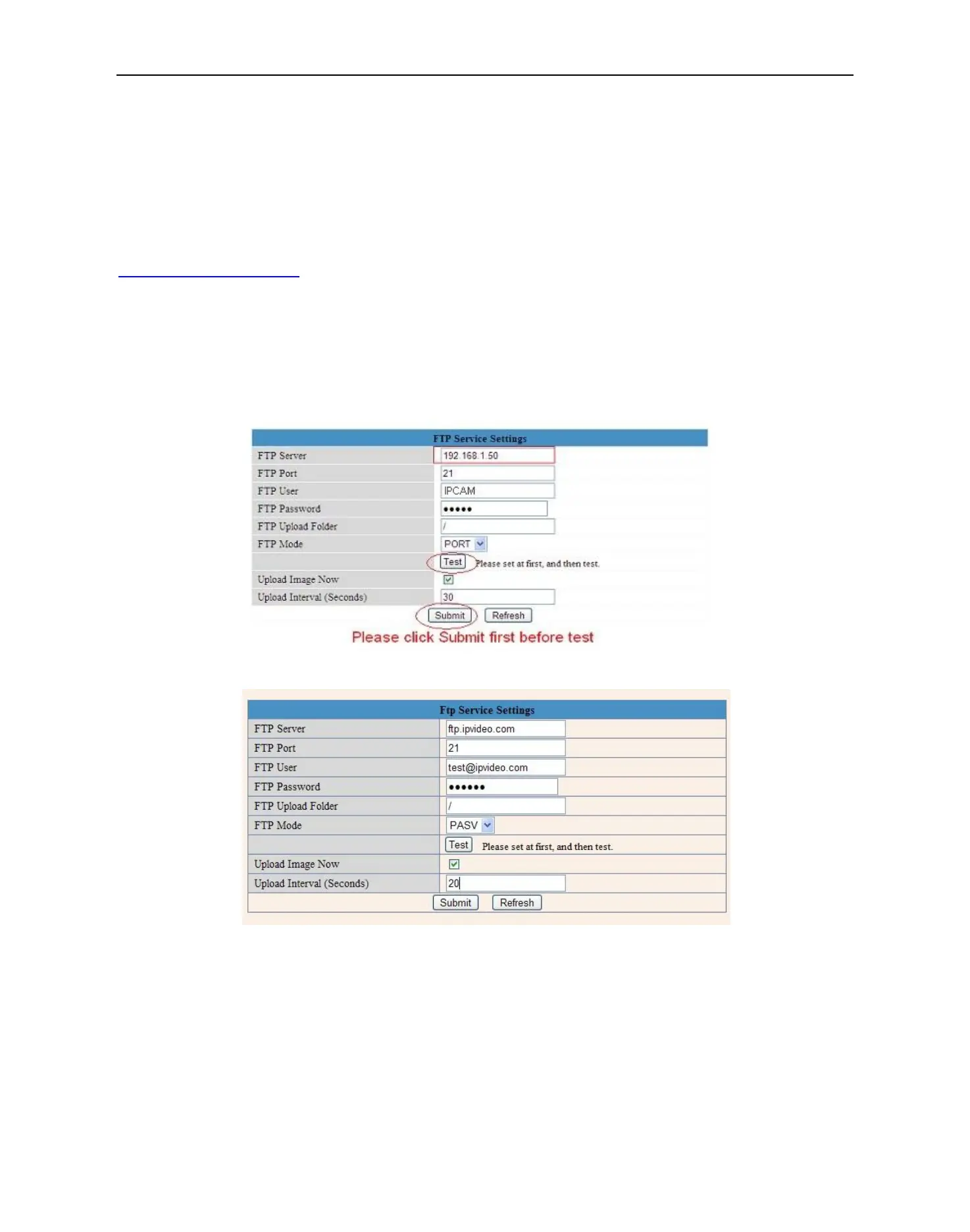 FTP Upload Folder: Make sure that the folder you plan to store images exists. The camera will not create the