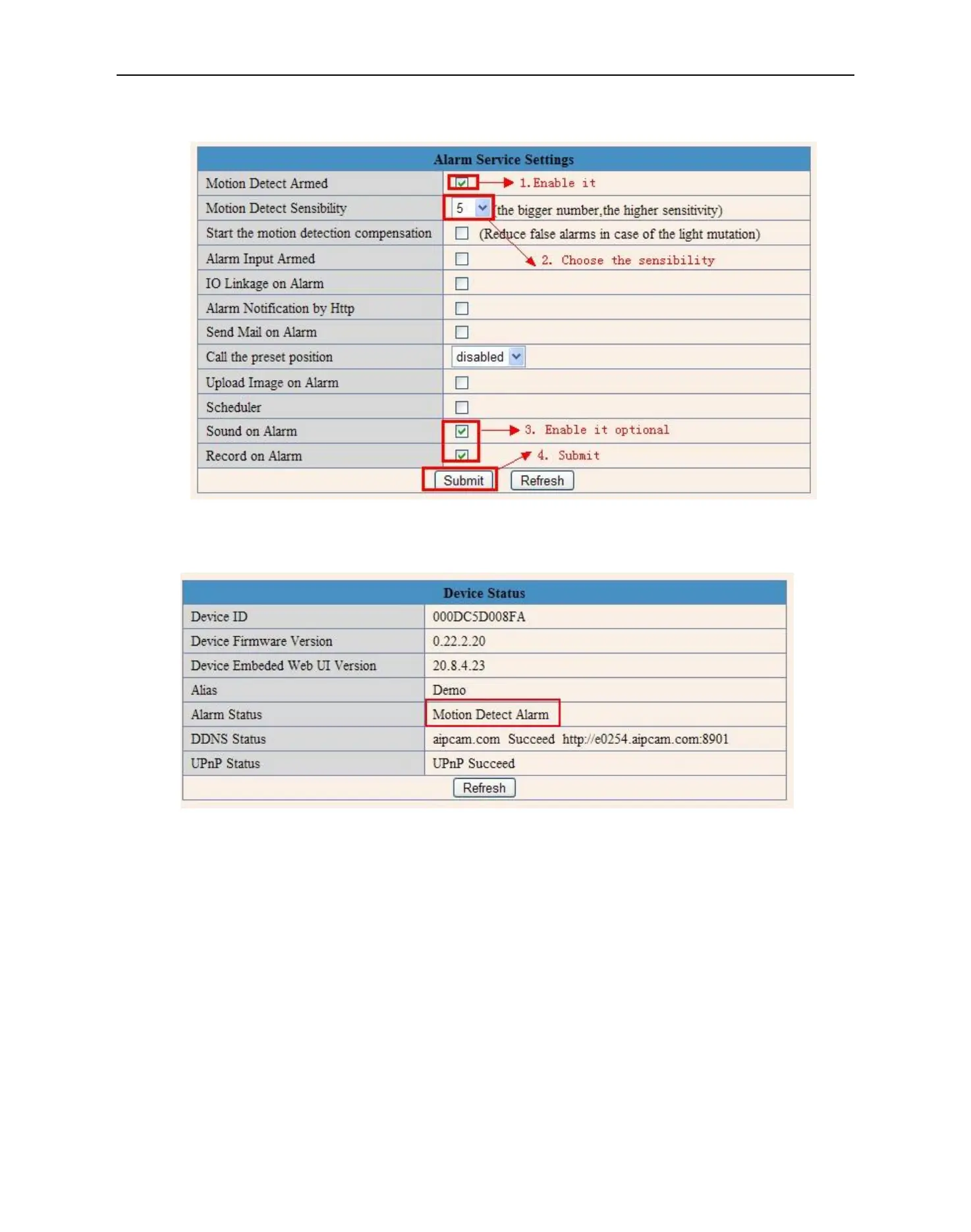 After enable motion detect armed, if there is motion triggered, the Alarm Status will turn to Motion Detect