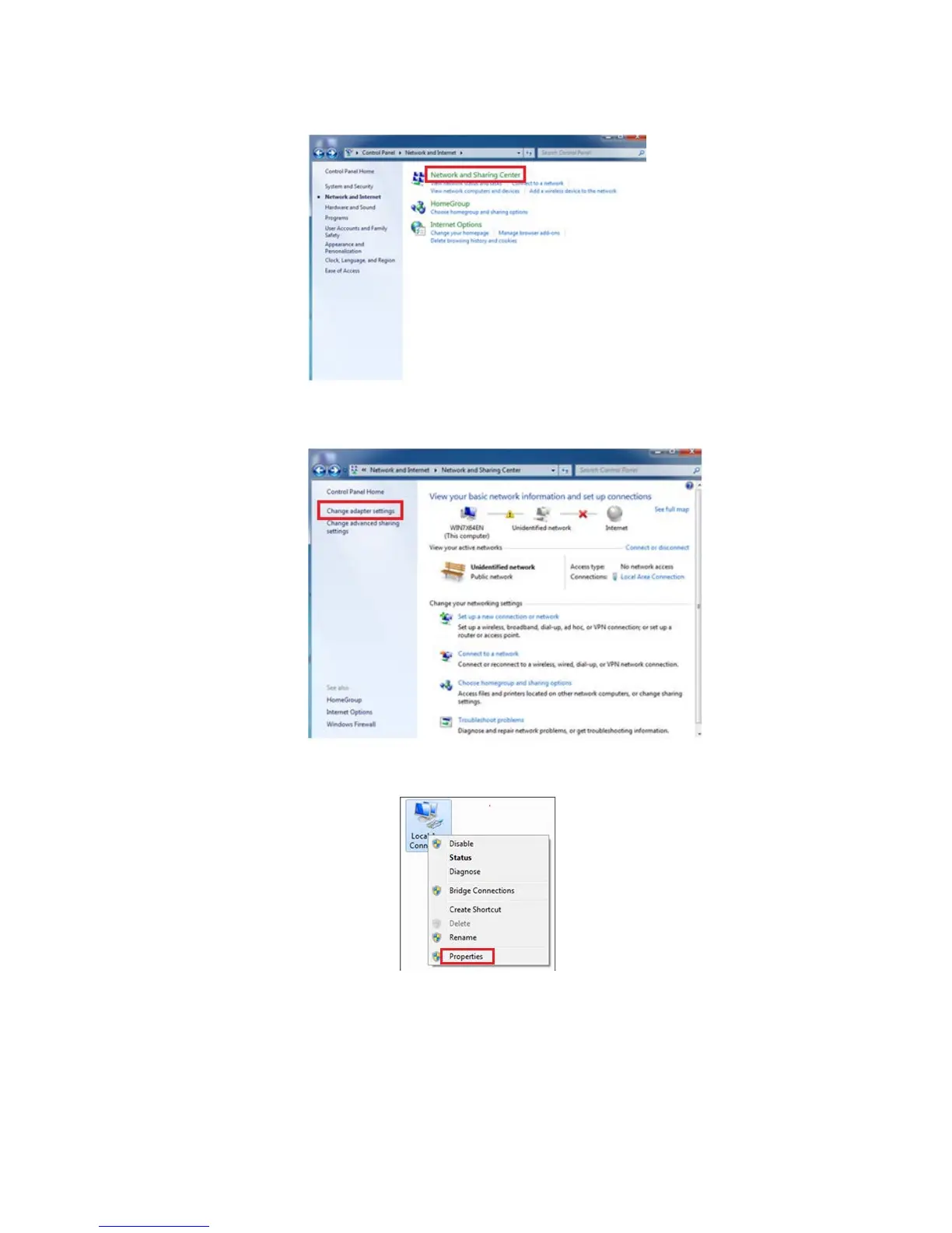 5. Click Local Area Connection and select Properties.