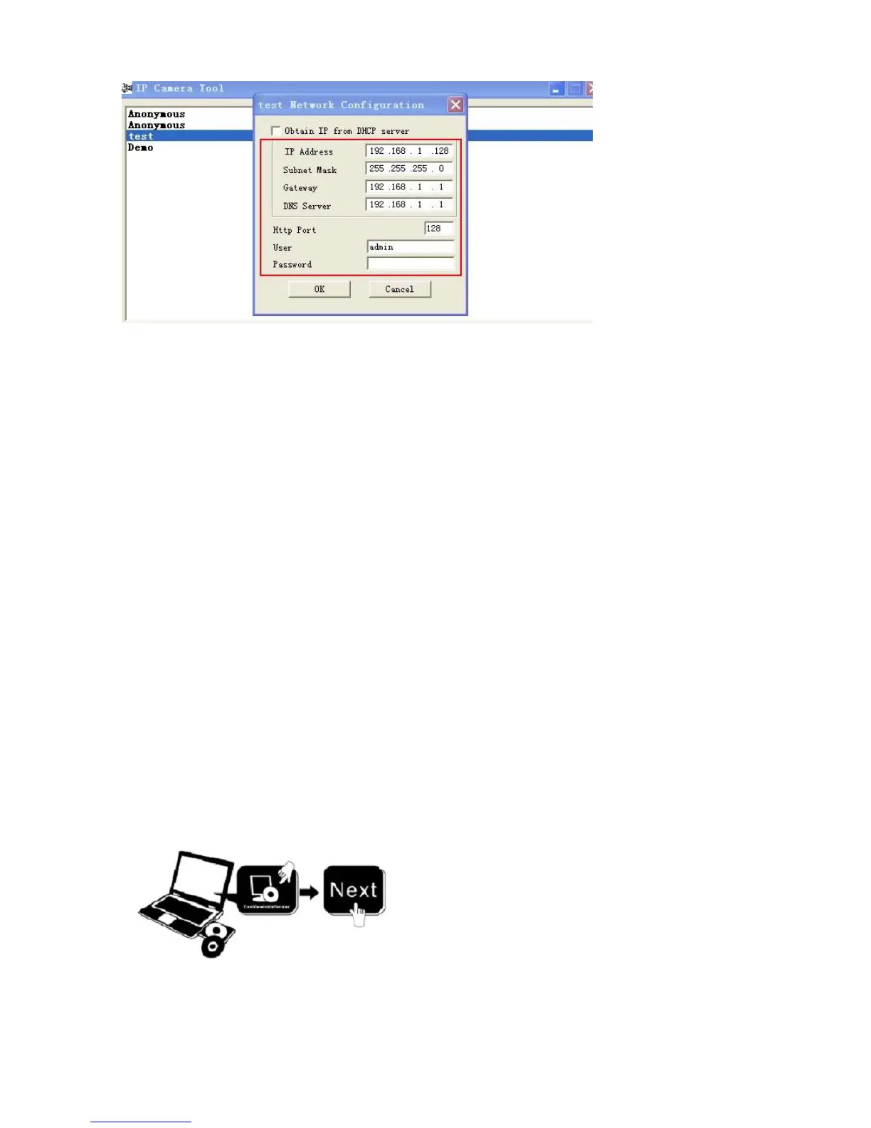 2. When current computer is the stable IP, (none DHCP IP), the first time use IP Camera, you