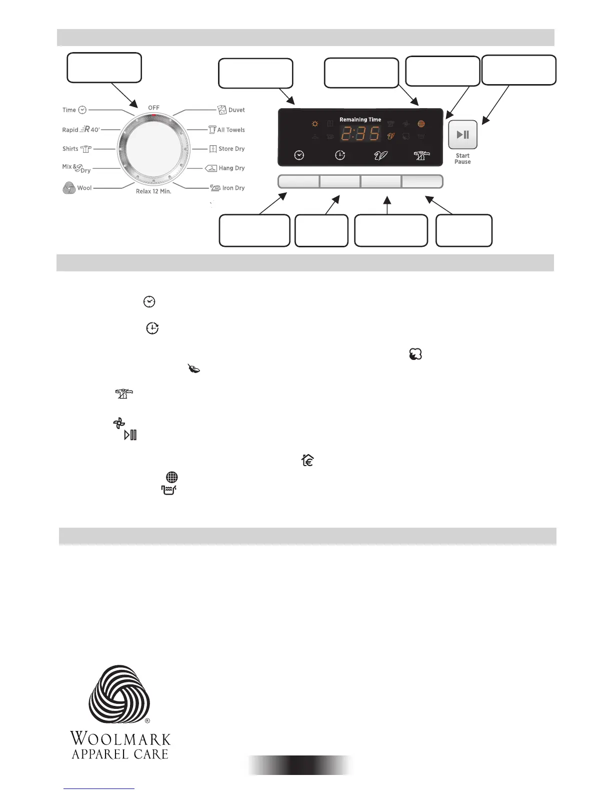 Tørkesyklusen for ull for denne maskinen er godkjent av The Woolmark Company
