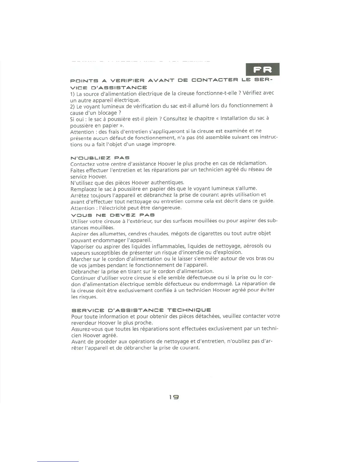 Contactez votre centre d'assistance Hoover le plus proche en cas de réclamation.