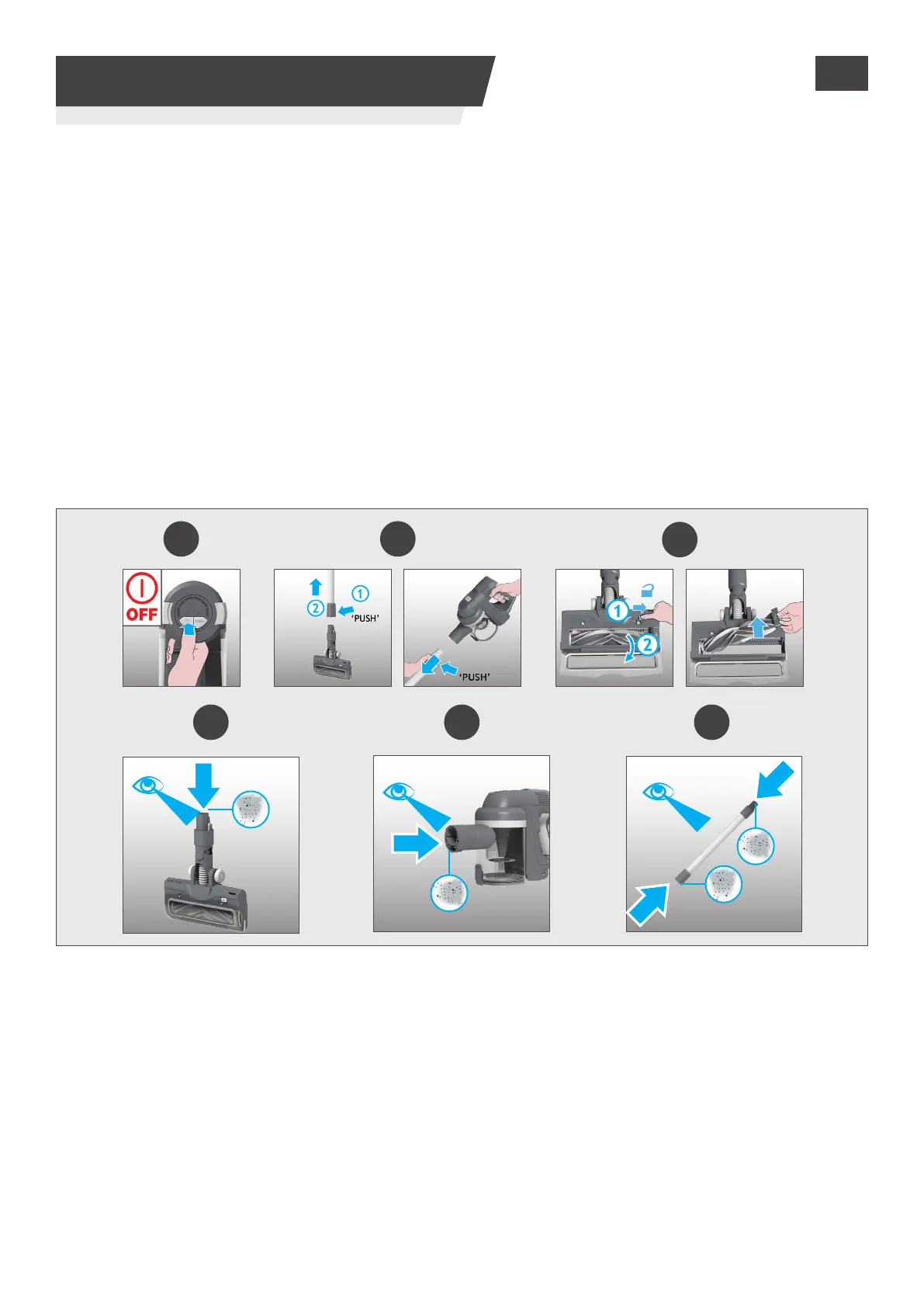 2. Διαχωρίστε το ακροφύσιο δαπέδου, τον σωλήνα και τη μονάδα χειρός σύμφωνα με τις προηγούμενες