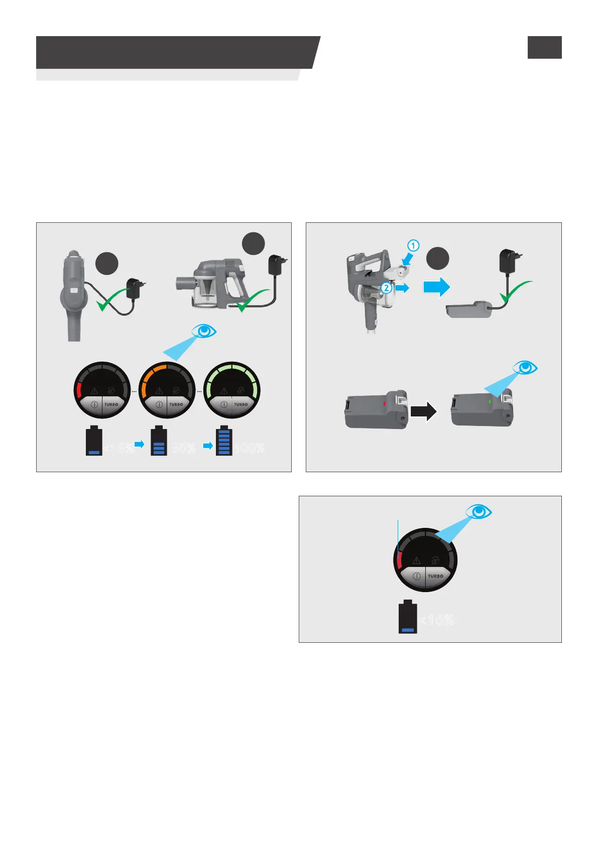1. Je-li produkt plně smontován jako tyčový vysavač nebo umístěn na nástěnném držáku, bude stav