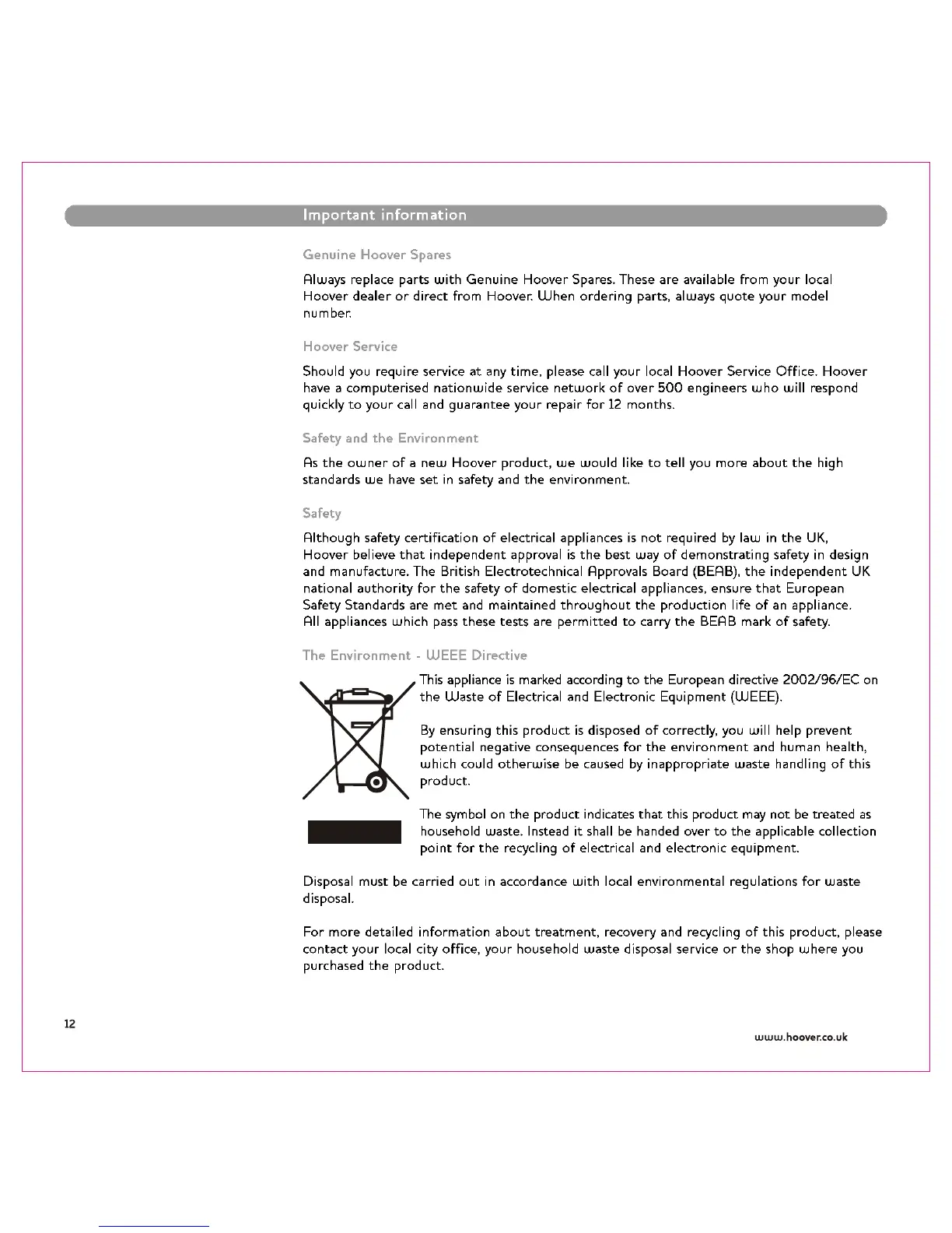 Hoover PERFORMER - Important Information; Genuine Hoover Spares; Hoover Service; Safety and the Environment