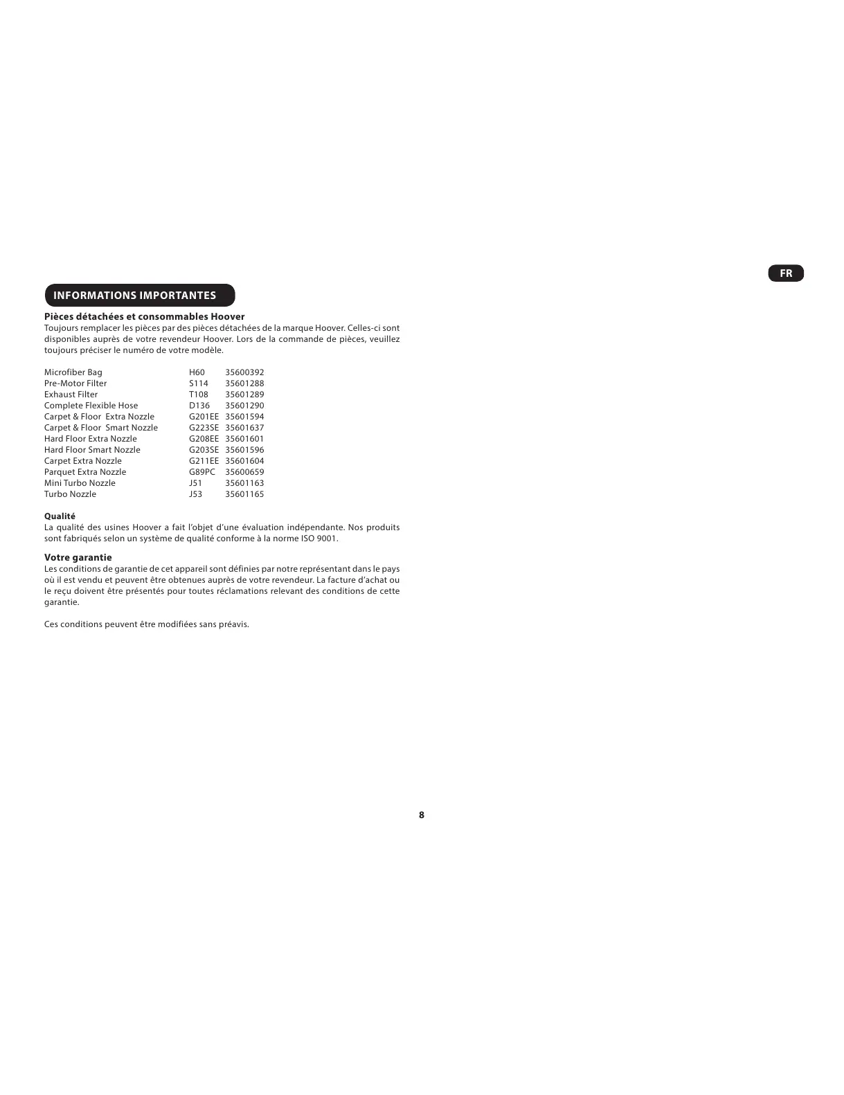 disponibles auprès de votre revendeur Hoover. Lors de la commande de pièces, veuillez