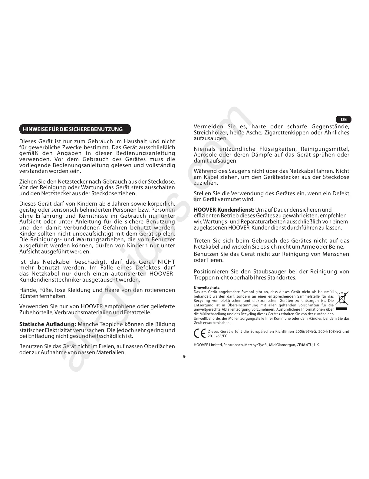 Verwenden Sie nur von HOOVER empfohlene oder gelieferte