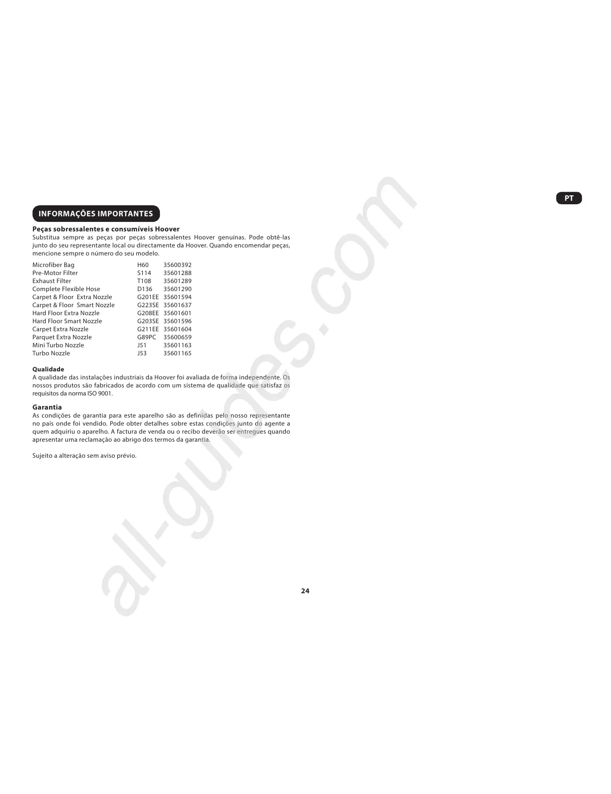 Substitua sempre as peças por peças sobressalentes Hoover genuínas. Pode obtê-las