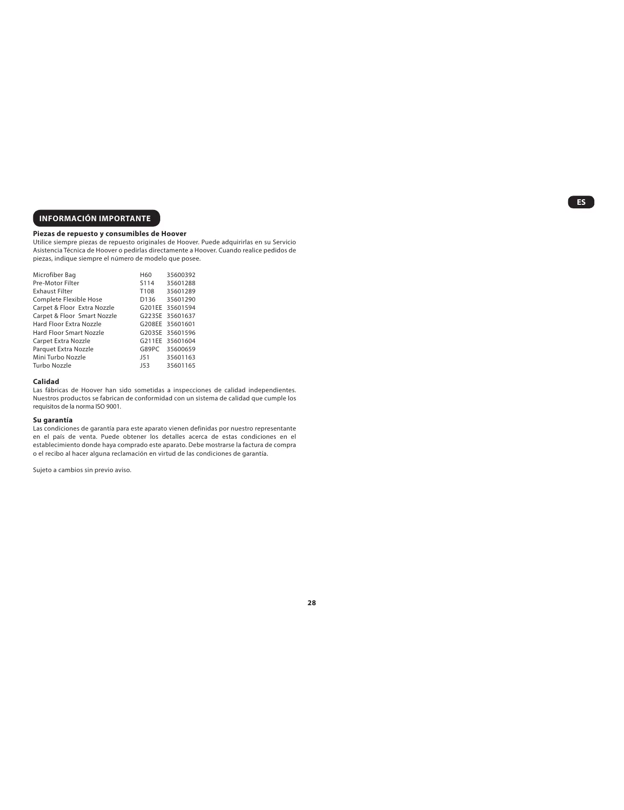 Asistencia Técnica de Hoover o pedirlas directamente a Hoover. Cuando realice pedidos de