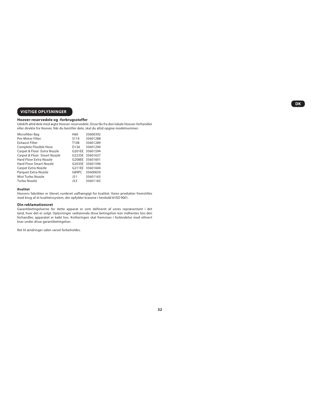 Udskift altid dele med ægte Hoover-reservedele. Disse fås fra den lokale Hoover-forhandler