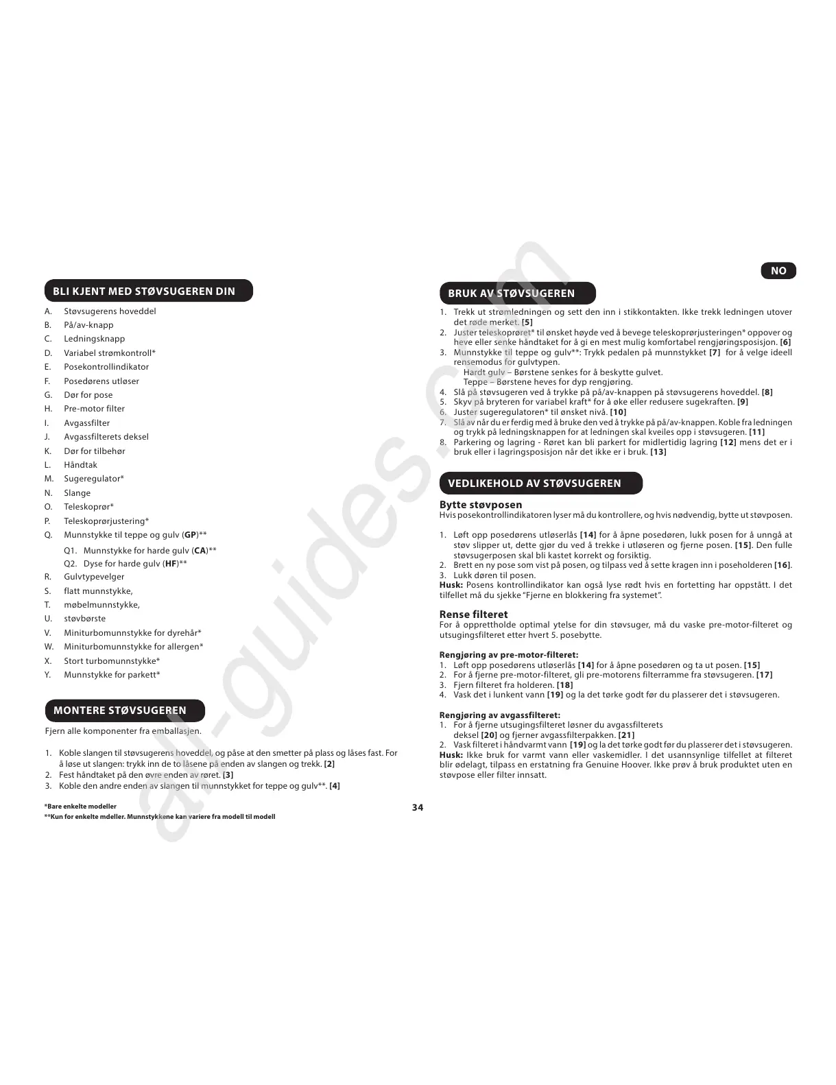 blir ødelagt, tilpass en erstatning fra Genuine Hoover. Ikke prøv å bruk produktet uten en