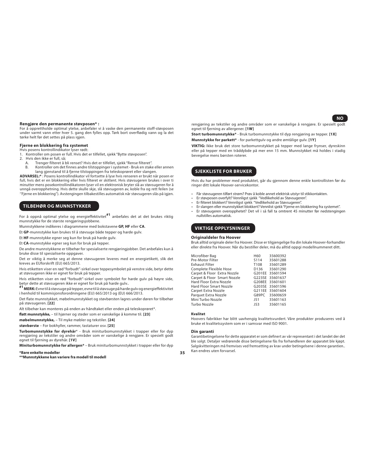 Bruk alltid originale deler fra Hoover. Disse er tilgjengelige fra din lokale Hoover-forhandler