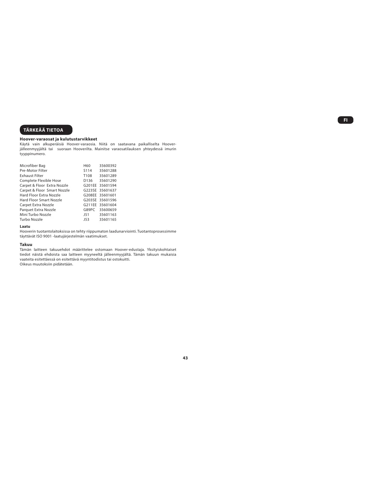 Tämän laitteen takuuehdot määrittelee ostomaan Hoover-edustaja. Yksityiskohtaiset