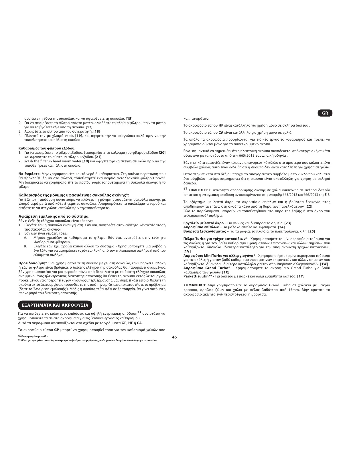 θα προκληθεί ζηιά στα φίλτρα, τοποθετήστε ένα γνήσιο ανταλλακτικό φίλτρο Hoover.